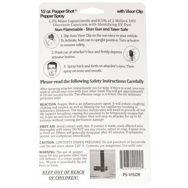 Pepper Shot 1.2% MC 1⁄2 oz w/auto visor clip. Pepper Shot Pepper Spray is made with 1.2% Major Capsaicinoids. The Major Capsaicinoids are the true heat measure and Pepper Shot 1.2% MC is more effective than of most other pepper sprays. In addition to causing an attacker pain, The Pepper Shot 8.5% oleoresin capsicum formula swells the mucous membranes, which makes breathing difficult, and swells the veins in the eyes, causing the eyes to close. It’s made from 2,000,000 SHU’s of raw pepper and these effects can last up to 45 minutes and cause no permanent damage. Has a UV identifying dye to help aid in the identification of an attacker. This is one of our most popular pepper sprays. It fits on the visor of your vehicle, giving you pepper protection where you need it the most.